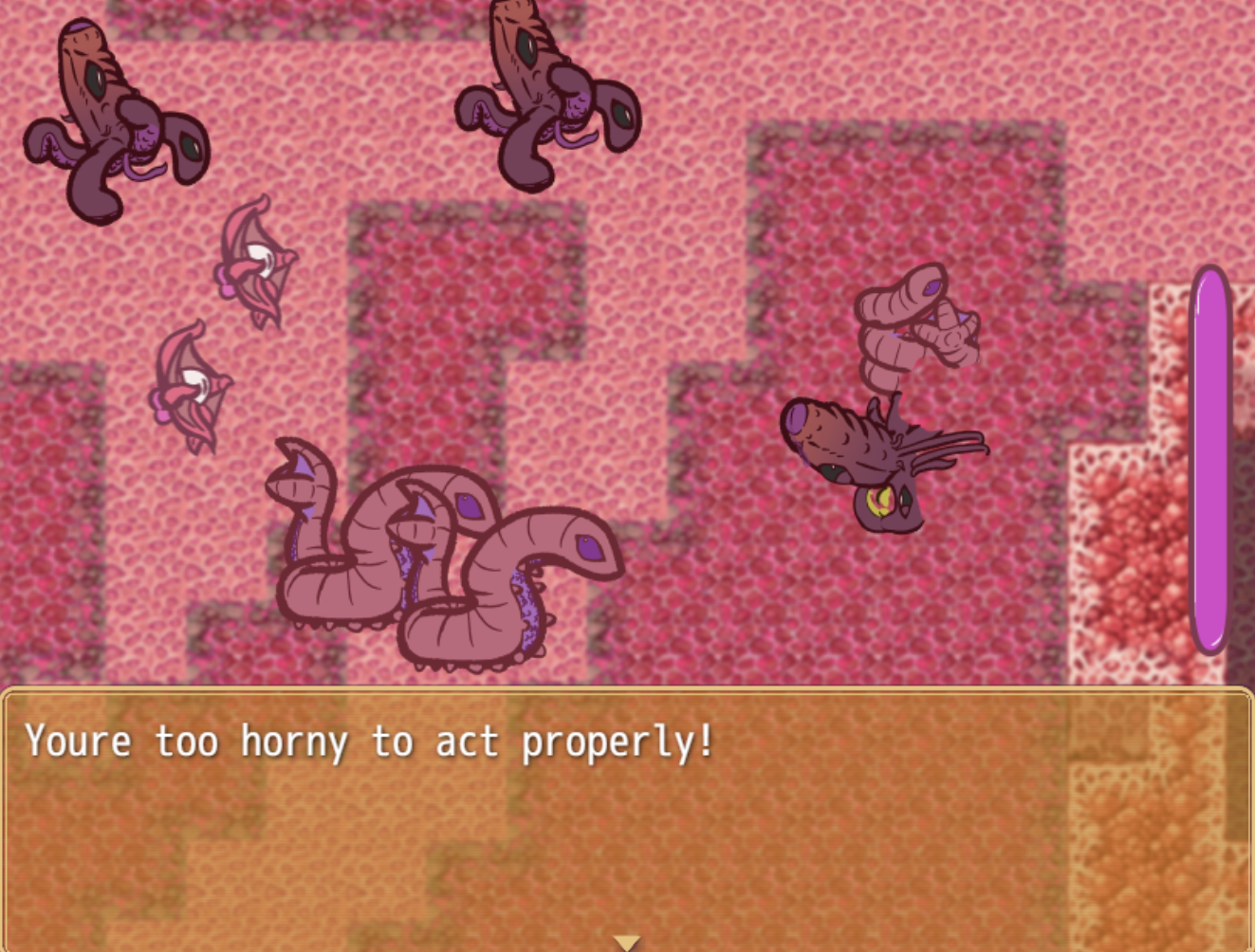 * Maybe give the player a tell that the blue pools of water damage you if you go trough them, and that the pink ones raise your lust if you interact with them, a small QoL that wouldn't be bad.
